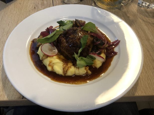 Hovězí konfit s omáčkou z brandy a bramboro-smetanovým pureé (219 Kč)