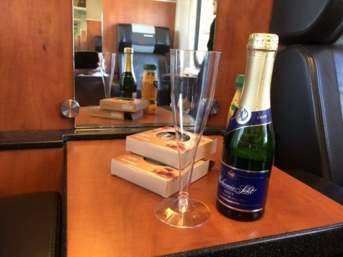 Total price per person, one-way, departing Wednesday early afternoon, was 800 Kč and that includes one free Bohemia Sekt, bottle of water, a cookie and tea or coffee. Good value for a four-hour journey. We paid 700 Kč for the Prague – Vienna journey on České dráhy.