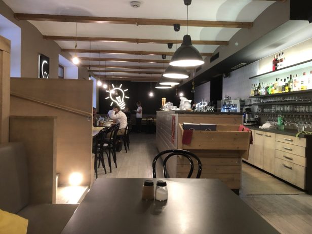 A 0.15l glass of Montepulciano d’Abruzzo DOC 2018, Poderi Marchesi Migliorati, Abruzzo was 120 Kč. A large carafe of tap water was charged at 20 Kč per person – that’s an odd pricing strategy, but is fine so long as refills are free.