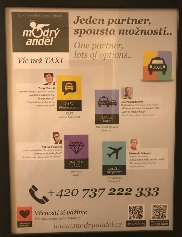 Modrý anděl started out as a ‘we’ll drive you and your car home’ service. That was pretty popular, especially in a country where the alcohol limit for driving is zero. They then expanded into a regular taxi service. I’m not sure when the Apple/Android booking app with GPS locator appeared, but it was certainly before I’d seen anything similar, including the Uber app. At the time it was revolutionary, especially for expats who often didn’t know where they were or couldn’t pronounce the name of the street.