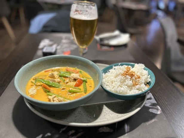 I asked for a red duck curry, but that they had ran out of duck. I went for red chicken curry (235 Kč) with jasmine rice (45 Kč). Again, nicely presented, but with almost no chicken. Imagine if you chopped up the contents of three McDonalds chicken nuggets – that would be the amount of chicken.