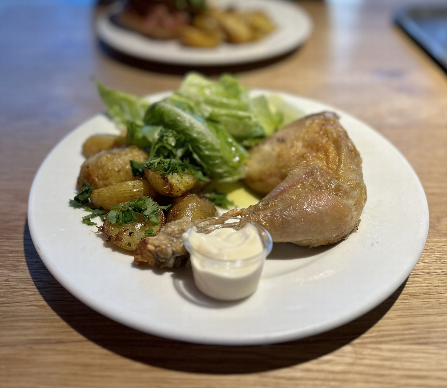 The chicken was moist and tasty. The salad had a nice olive oil dressing.