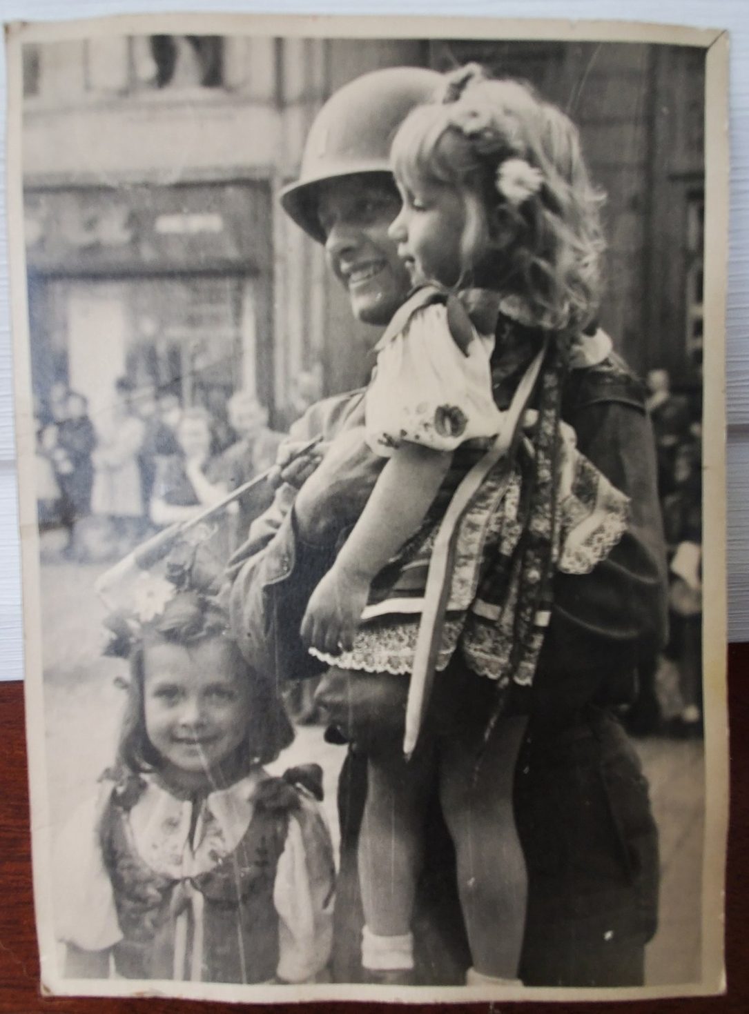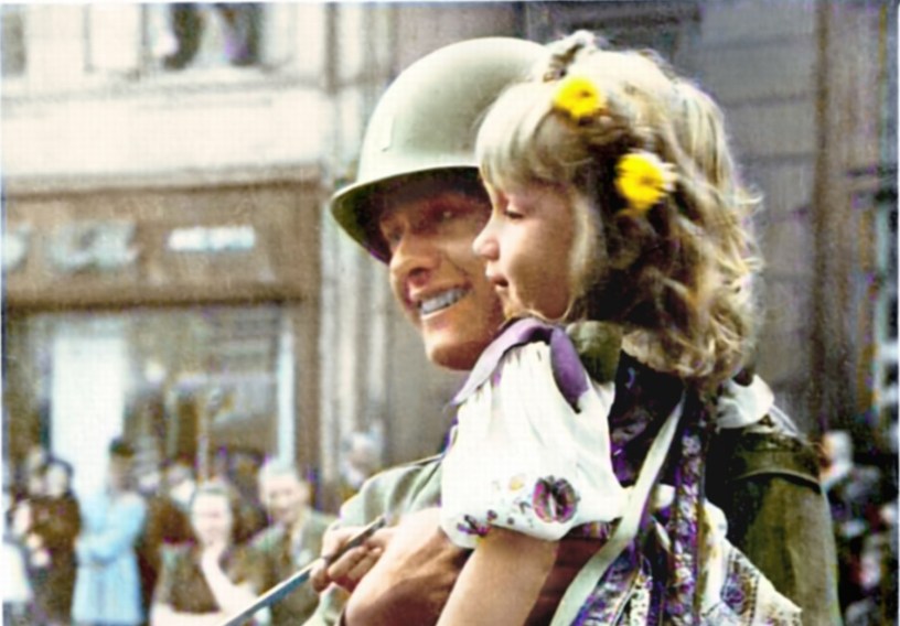 This colourised photo was taken May 14th 1945 during the liberation of Strakonice. The two little girls in the photo must be over eighty years old now. The daughter of the US soldier would like to find them.