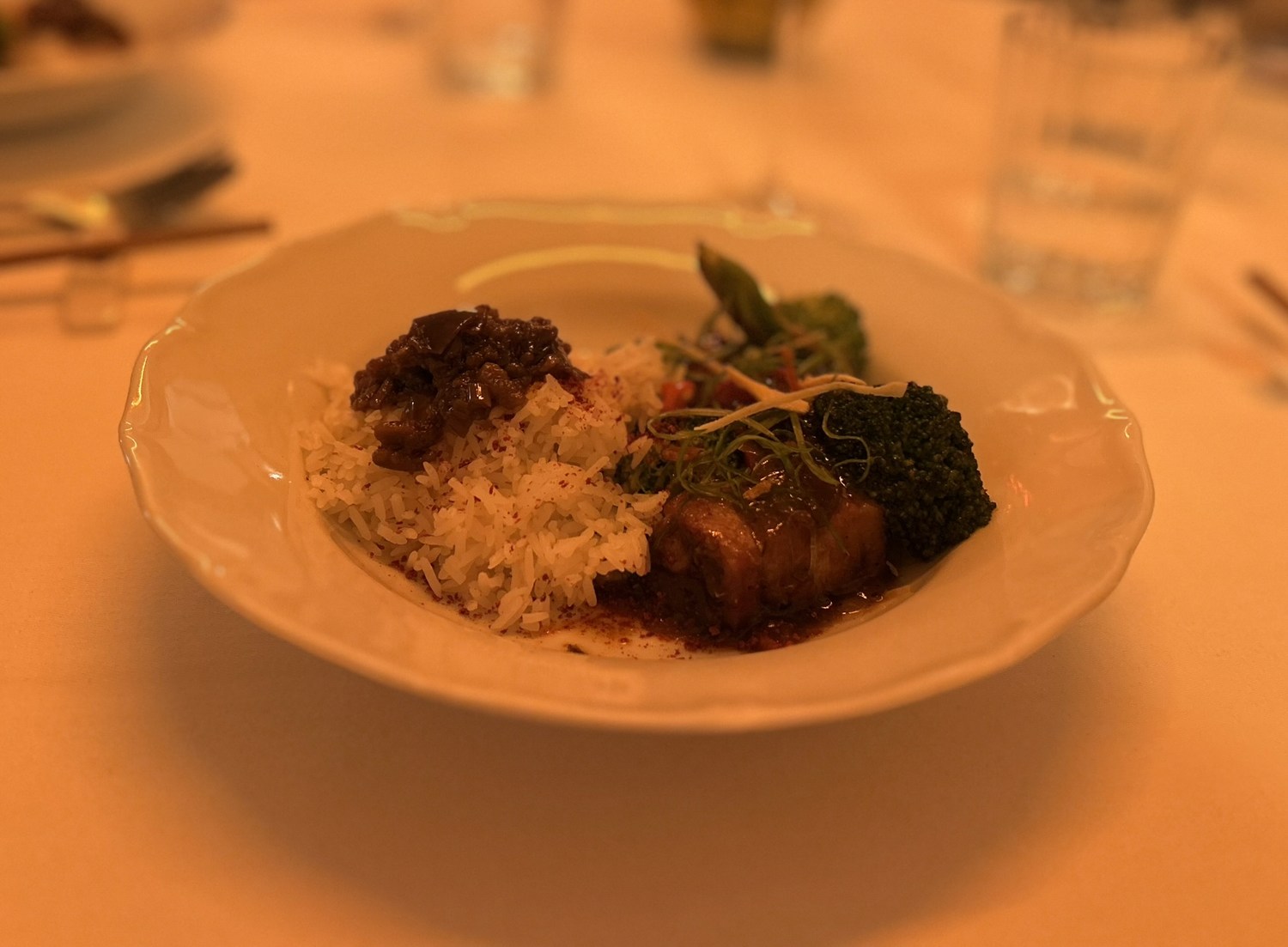 The organic pork belly & broccoli & three pepper sauce, jasmine rice was dumped on our table within minutes of the removal of our starter plates. Another lovely dish, slightly tainted by the service and also the echoey noise level in the room was starting to give us a headache.