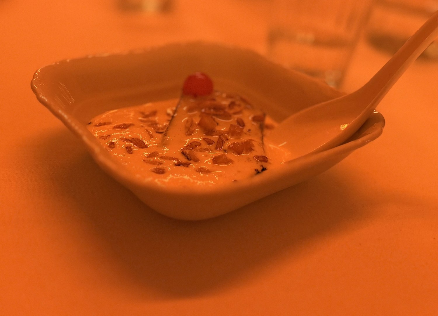 It then took 20 minutes before the delicious dessert appeared, a chocolate almond cake with mascarpone & cocktail cherry. This time, the dish was described.